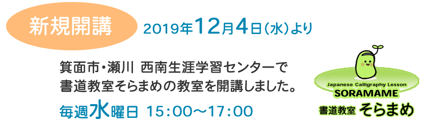 2019年12月4日(水)より、箕面市・瀬川にある西南生涯学習センターで、書道教室そらまめの新教室をオープンしました。